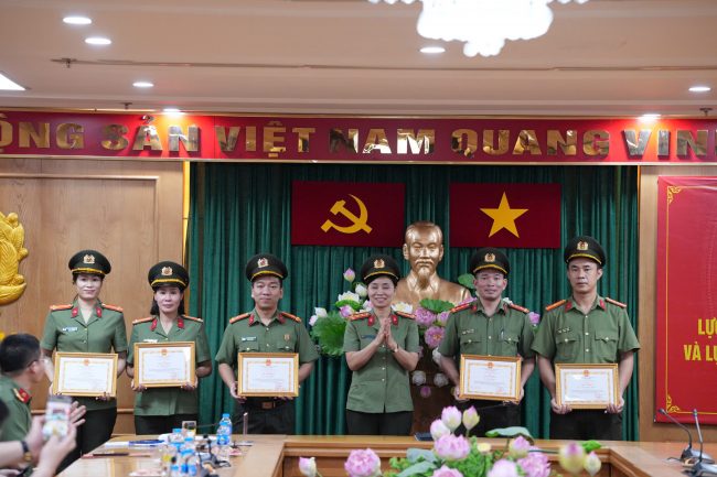 Đồng chí Đại tá Nguyễn Thị Thúy Thanh, Phó Cục trưởng Cục Công tác Chính trị trao tặng Giấy khen cho các tập thể, cá nhân có thành tích xuất sắc