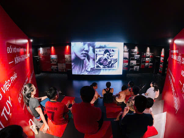 <Khách tham quan xem phim tư liệu tại gian trưng bày Bảo tàng CAND>