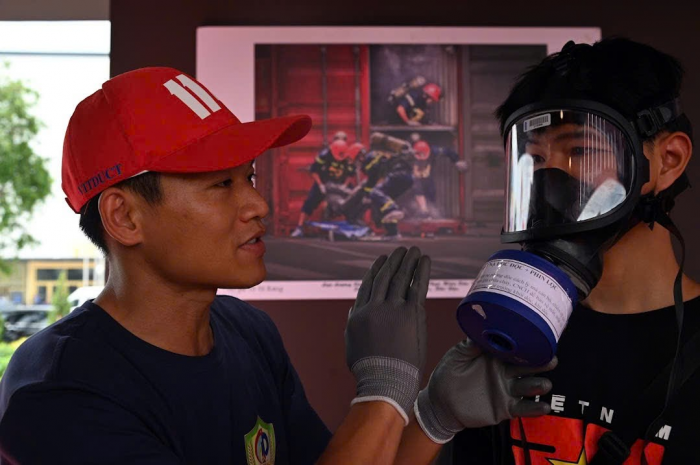 <Lực lượng Cảnh sát PCCC&CNCH hướng dẫn khách tham quan sử dụng các thiết bị>