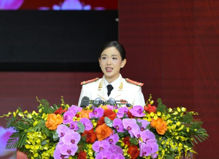 <Thượng úy Trần Hà My, đoàn viên thanh niên Bộ Tư lệnh Cảnh vệ, đại diện cho tuổi trẻ Công an nhân dân phát biểu tại Lễ kỷ niệm>