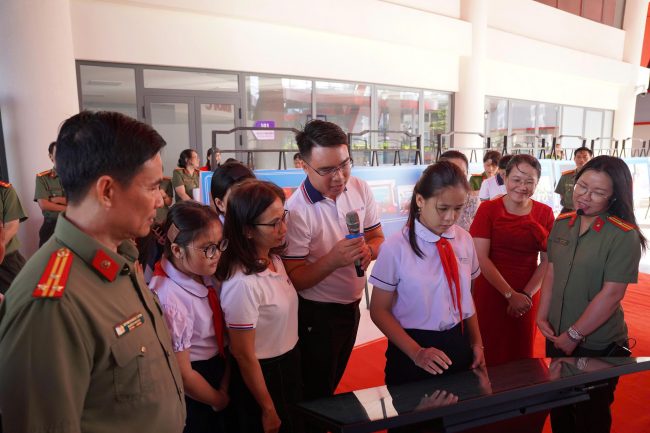 Đại biểu và các em học sinh tham quan gian trưng bày của Mobifone và trải nghiệm trả lời câu hỏi trên màn hình tương tác cảm ứng