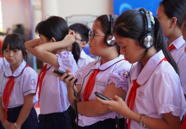 Học sinh trải nghiệm nhận diện hành vi lừa đảo qua thiết bị âm thanh mô phỏng cuộc gọi điện thoại